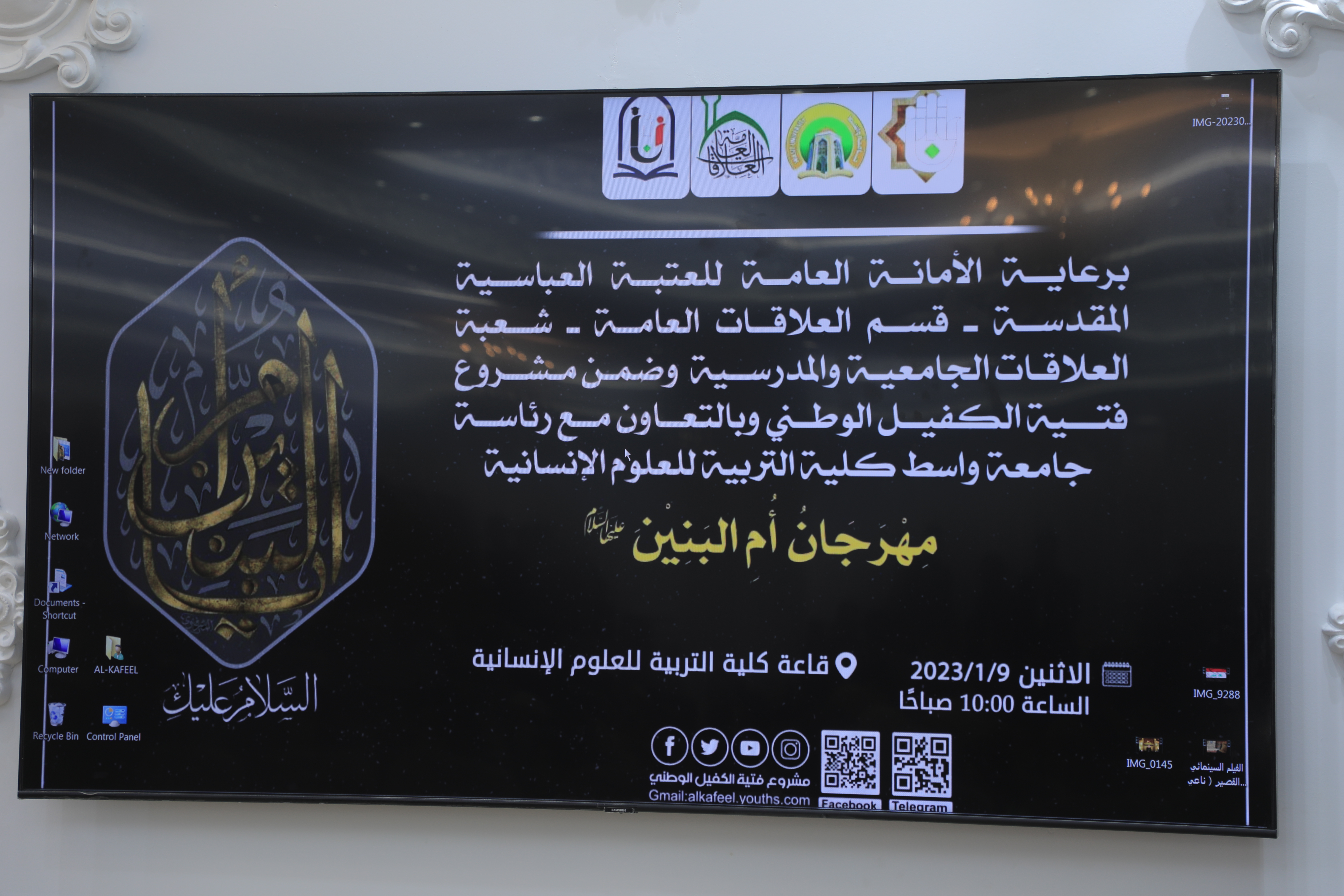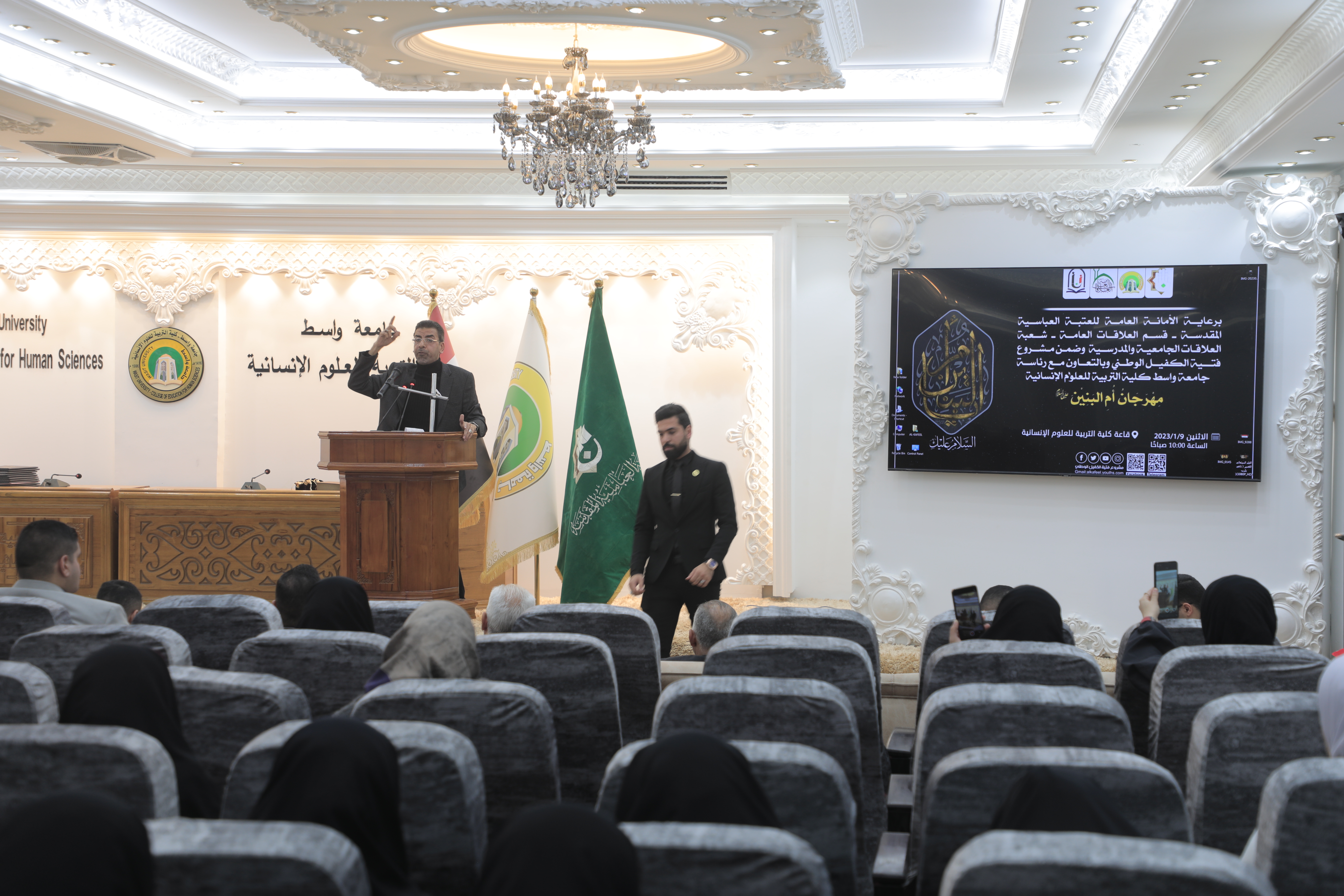 نظّمَتْ كُليّةُ التَربيَةِ لِلعلُومِ الإنسانِيّةِ فِي جامِعَةِ واسِطَ، بِالتعاوُنِ مَع العَتبةِ العَبّاسيّةِ المُقدَّسةِ مَهرجانَ أمِّ البَنينَ عَلَيها السّلامُ السّنَويَّ، الذِي احتَضنَتْ فعّاليّاتِهِ قاعَةُ الكلّيةِ المَركزِيّةُ وَسطَ حُضورٍ غفيرٍ.