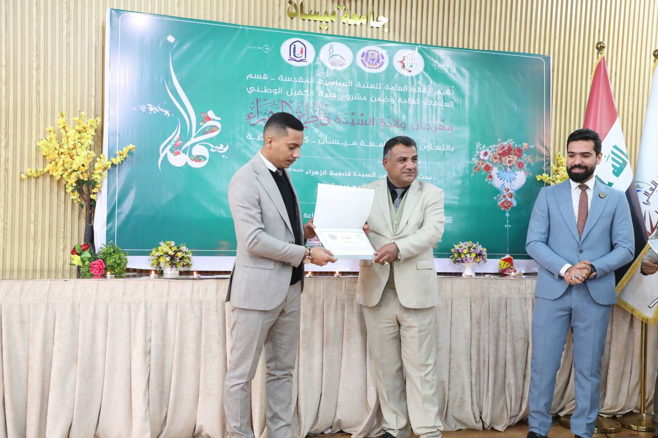 حضور ومشاركة سجلها قسم الشؤون الدينية بفعاليات مهرجان ولادة السيّدة فاطمة الزهراء(عليها السلام)، الذي نظّمه قسمُ العلاقات العامة في العتبة العباسية، بالتعاون مع كلّية التربية في جامعة ميسان.