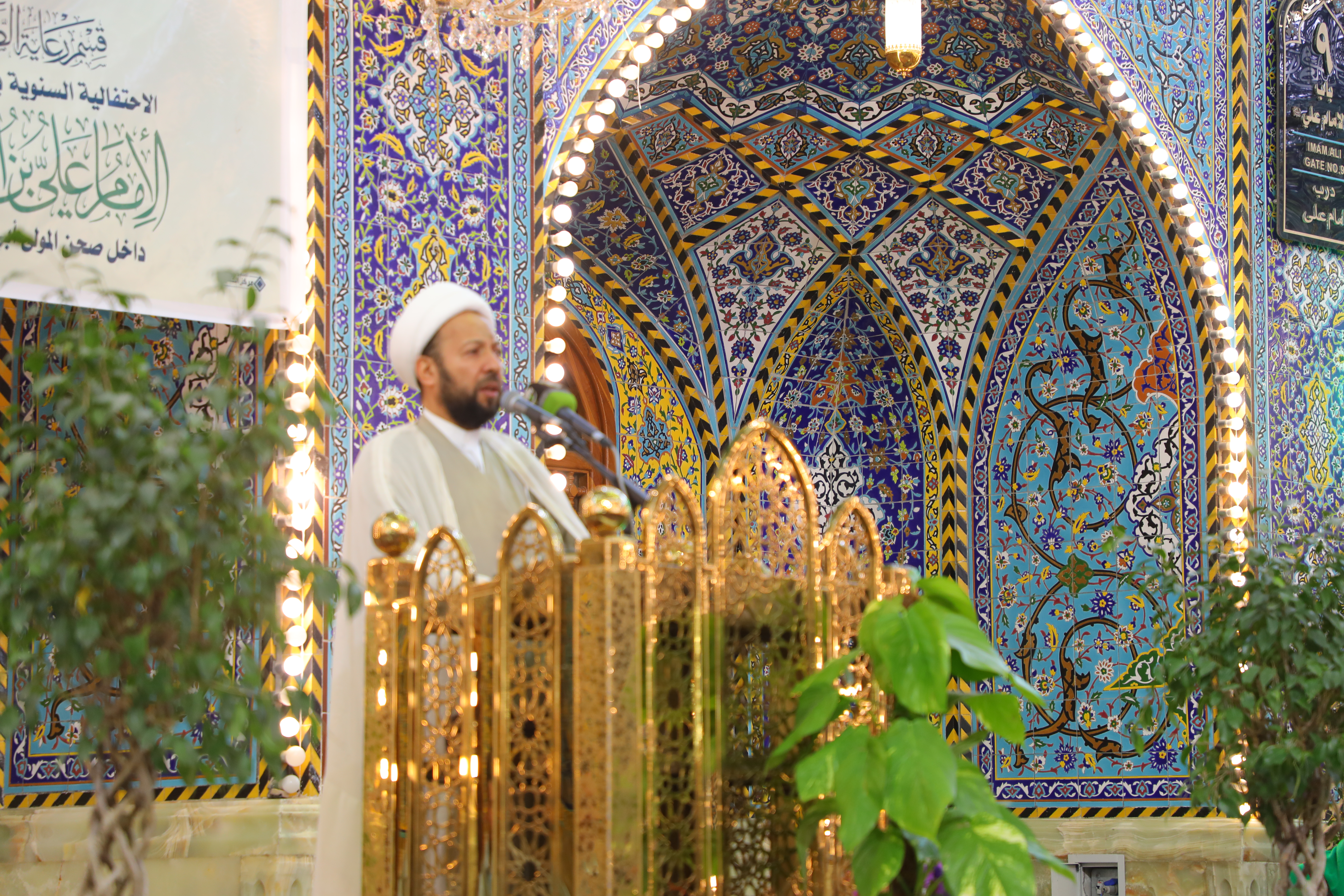 أذ استهل الاحتفال بعد تلاوة آيات من الذكر الحكيم كلمة للشيخ داخل النوري استهلّها بتقديم التهاني والتبريكات بهذه المناسبة، متحدِّثاً عن محطّاتٍ مهمّة من حياة الإمام علي (عليه السلام)، كالولادة المباركة ، وما ورَدَ فيه من أحاديث دلّتْ على عِظَم شأنه ومنزلته التي حباه بها الباري عزّ وجلّ ، مشيراً إلى قبساتٍ من العلم الزاخر الذي امتلكه (صلوات والله وسلامه عليه) وما قدّمه للأمّة الإسلاميّة، علاوةً على ما جرى عليه في تلك الحقبة من حياته الشريفة.