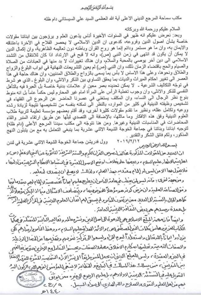 السلام عليكم ورحمة الله وبركاته وبعد : نعرض عليكم انه ظهر في السنوات الأخيرة أناس يدّعون العلم و يروّجون بين ابنائنا مقولات خاصة بشان أصول الدين وفروعه ، كدعوى أن الدين الاسلامي لا يحصر الفلاح في الآخرة باعتناقه والايمان به ، وأن ما هو مستمر ودائم إنما هو روح القرآن وباطنه دون تعاليمه الظاهرية ، وان إكمال الدين لا يمكن أن يكون قد انتهى في زمن النبي ( ص ) ، وانه لا قبح في الارتداد اذا كان للانتقال من التشدد الاسلامي الى دين آخر يوصي بالمحبة والسلام ، وان هناك تغييرات لا بد منها في العبادات من الصلاة والصيام والحج باقتضاء الزمان ذلك ، وأن النبي ( ص ) لم يعين التشريعات النهائية في ابواب البلوغ والزواج والطلاق ونحوها ، وعلى هذا الأساس لا بأس بما يسمى بالزواج والطلاق المدنيين ، وأن هناك حاجة في هذا العصر الى تغيير احكام الميراث والديات بما يحقق التساوي بين الذكر والانثى ، وان البلوغ - الذي هو شرط في توجه التكاليف الشرعية . لا يمكن تحديده بعمر معين أو علامات بدنية خاصة بل العبرة فيه بالتأهل النفسي للذكر والانثى ، وان وجوب تغطية الرأس على المرأة أمام غير المحارم ليس حكماً عاماً بل انه منوط بنوع نظر الرجال الى النساء ، وان المكلف يستغني في عصرنا الحاضر عن الرجوع الى الفقهاء في تشخيص وظيفته الدينية في كثير من الموارد ، بالنظر الى تمكنه بنفسه من تشخيصها نتيجة لزيادة رشده ووعيه وتكامل عقله ، ونظير ما تقدم مقولات كثيرة أخرى ، وقد أقام بعضهم مؤسسة تعليمية لتربية طلاب العلوم الدينية وفق هذه الأفكار وماً ماثلها ، بالإضافة الى التصدي لبثها عن طريق ارتقاء المنبر والقاء المحاضرات في المناسبات الدينية وغيرها . ومن هنا نتوجه الى مكتب سيدنا المرجع الأعلى ( دام ظله ) لتوجيه أبنائنا وبناتنا في جماعة الخوجة الشيعة الاثني عشرية بما ينبغي التعامل به مع من يتبنون النهج المذكور ، ولكم فائق الشكر والتقدير ۲۰۱۹ / ۲ / ۱۲