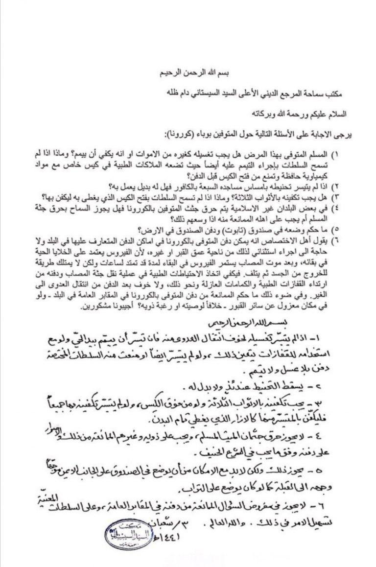 السيد السيستاني “دام ظله”يجيب على أسئلة حول تجهيز المتوفين بكورونا.