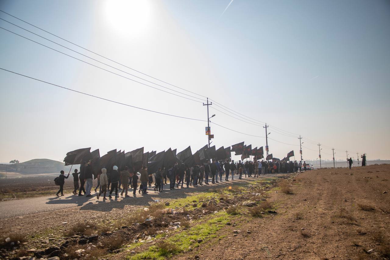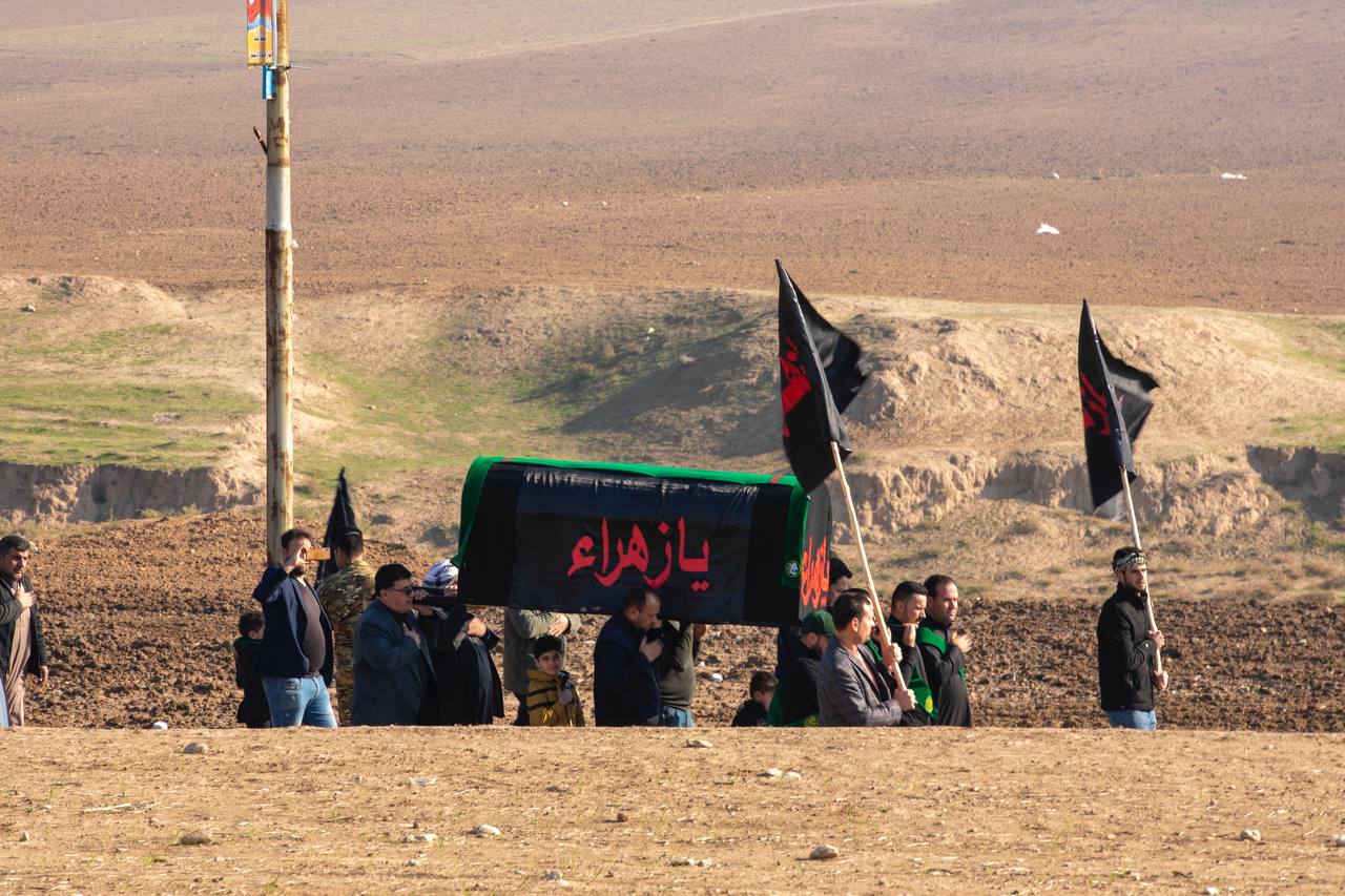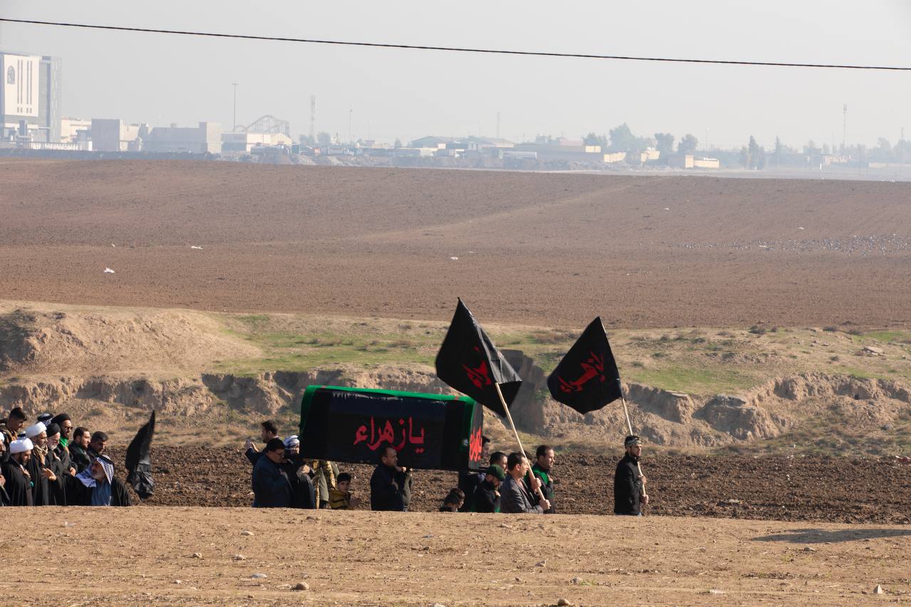 وأضاف "المسيرةُ تقدّمَها نعش رمزي سار حوله وجهاءُ المناطق وأعيانُهم وممثّلون عن حكوماتهم المحلّية والأمنيّة، وقد التحفت السوادَ ورُفعت فيها الراياتُ والشعاراتُ العزائيّة والولائيّة، مجدّدين البيعة بالثبات على هذا النهج والسير على خطى صاحبة الذكرى ".