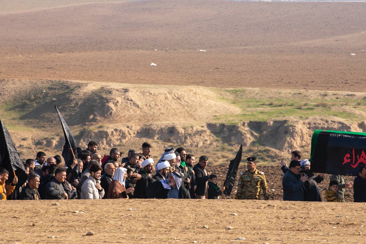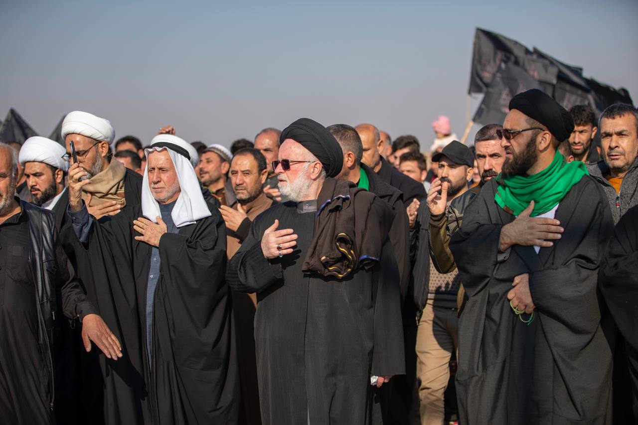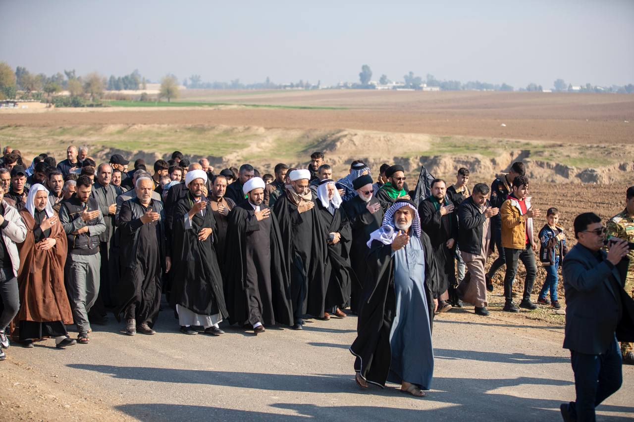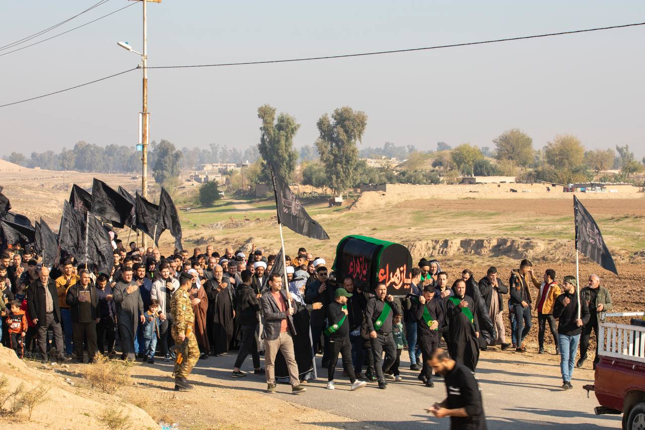وأضاف "المسيرةُ تقدّمَها نعش رمزي سار حوله وجهاءُ المناطق وأعيانُهم وممثّلون عن حكوماتهم المحلّية والأمنيّة، وقد التحفت السوادَ ورُفعت فيها الراياتُ والشعاراتُ العزائيّة والولائيّة، مجدّدين البيعة بالثبات على هذا النهج والسير على خطى صاحبة الذكرى ".