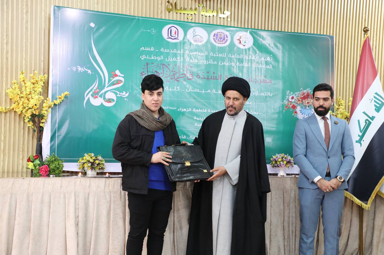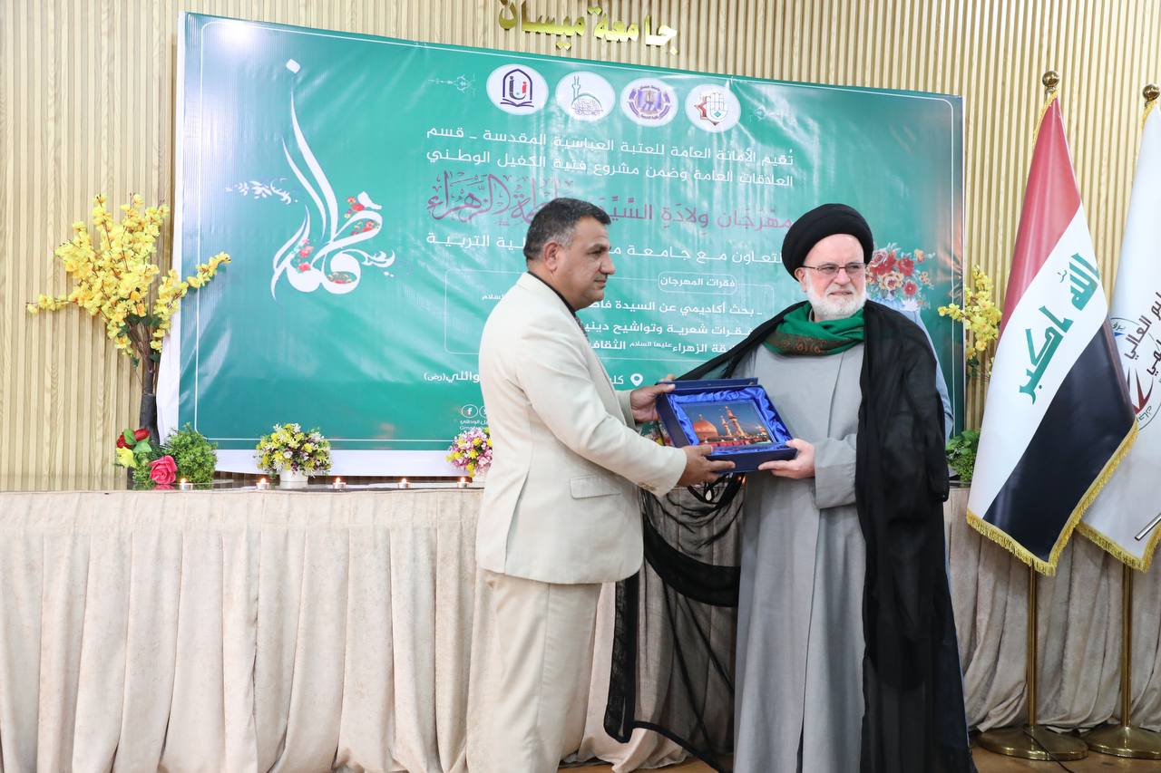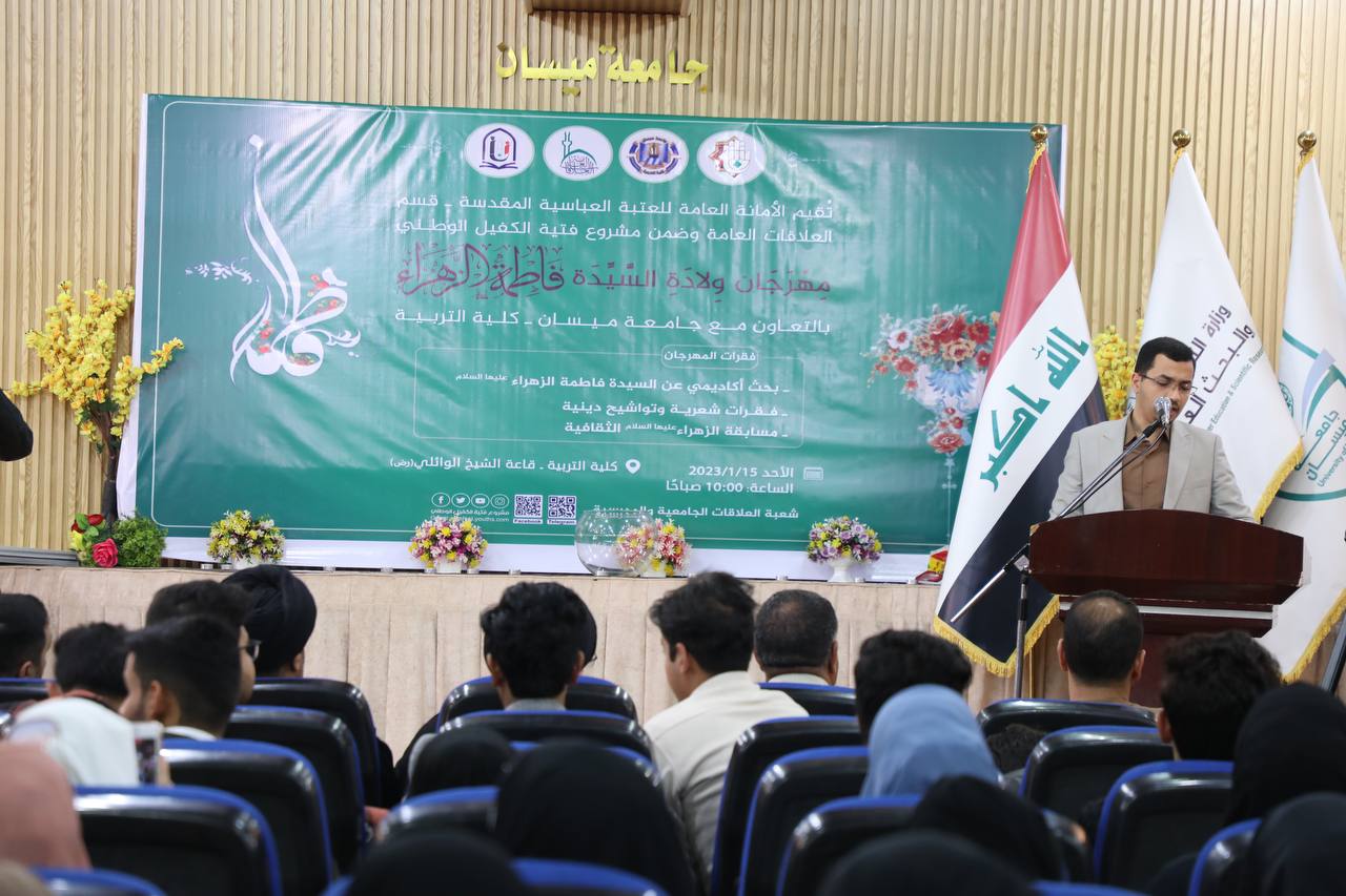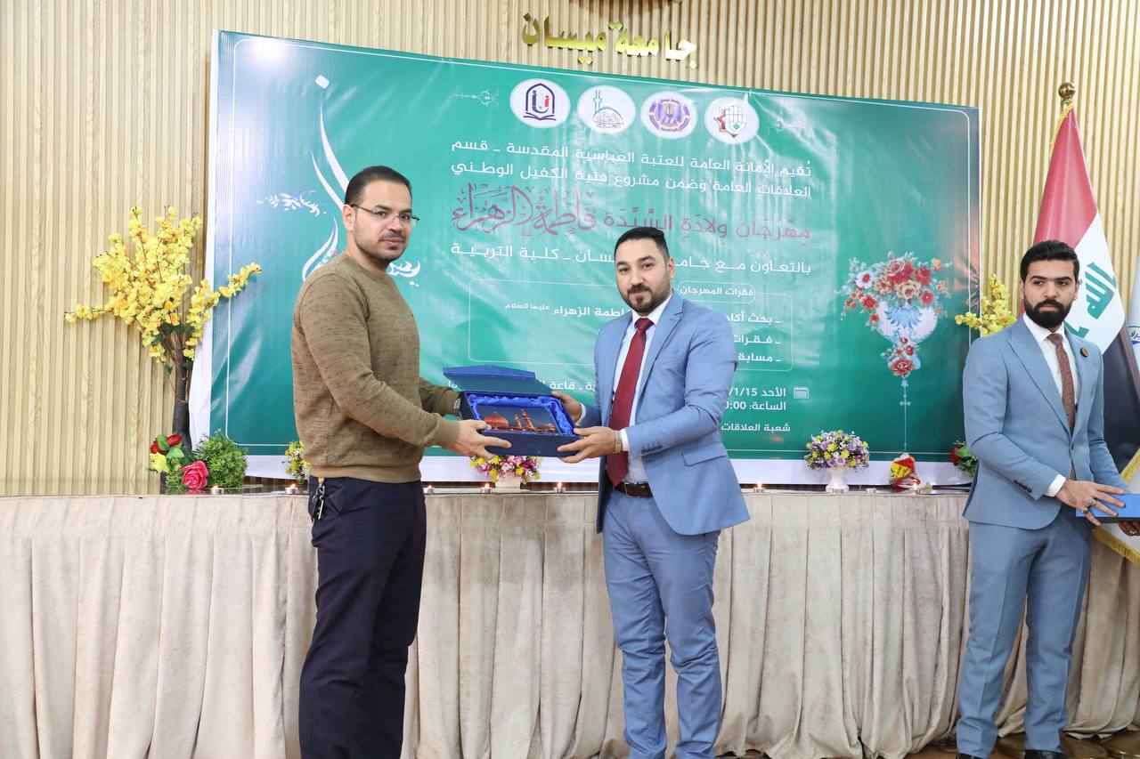 حضور ومشاركة سجلها قسم الشؤون الدينية بفعاليات مهرجان ولادة السيّدة فاطمة الزهراء(عليها السلام)، الذي نظّمه قسمُ العلاقات العامة في العتبة العباسية، بالتعاون مع كلّية التربية في جامعة ميسان.