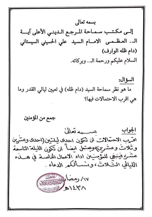 وجاء في نص السؤال "ماهو نظر سماحة السيد (دام ظله) في تعيين ليالي القدر وما هي اقرب الاحتمالات فيها".